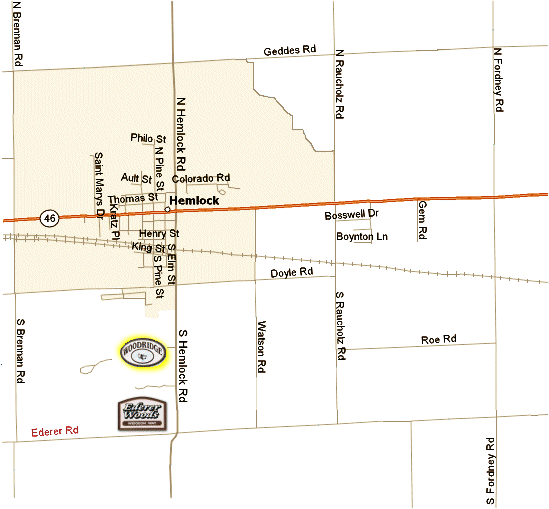The Woodridge Subdivision (Highlighted Below) is located on South Hemlock Road approximately 1 mile south of M46.